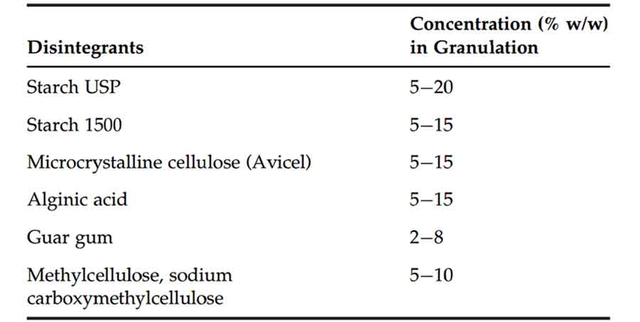 Examples and concentrations of disintegrants commonly used in tablet formulation